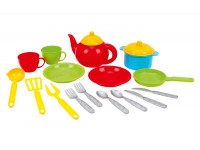 The tableware set includes: a frying pan, a kettle, a saucepan with a lid, 2 deep plates, 2 dinner cups and kitchen utensils.