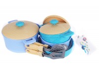 A total of 11 elements are included in the set, including: 2 pots, a frying pan, a saucepan, three lids for them, as well as a ladle, a slotted spoon, a large chef's fork and a spatula - everything you need from dishes to prepare a delicious dinner for a large doll family.