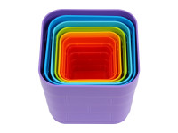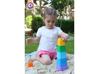 Colours of elements are selected in rainbow gamma. The child’s task is to select elements by size and shape in order to build a castle.