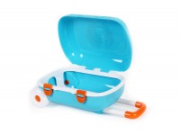 The suitcase is comfortable for children of different ages and heights, thanks to its adjustable handle. The open lid of the suitcase can be fixed in several positions, allowing the child to easily pack and unpack their belongings. Reliable clasps keep the lid securely closed, allowing toys to be safely stored inside. Additionally, the large sturdy wheels make it easy for the child to freely move the suitcase around.