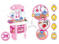 Complete set: toy kitchen, cooking panel with electronic module, tap, board, pot with lid, frying pan, cup - 2 pcs., saucer - 2 pcs., spoon - 2 pcs., fork - 2 pcs., knife - 2 pcs., plate - 2 pcs. , a candy box with a lid, a large fork, a skimmer, a spatula, a ladle, a cucumber, a carrot, an eggplant, a tomato, a box - 2 pcs., a sponge.