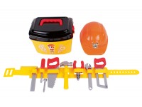 Pliers, saw on metal and on wood, angle, hummer, adjustable key, twin screwdriver will always be at hand. There is a bright orange helmet for the child`s safety. And of course, after work all the tools will be placed in the container. These games help to develop imagination, thinking and memory, they introduce children to different professions and tools, they teach to be tidy.