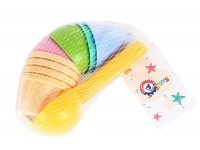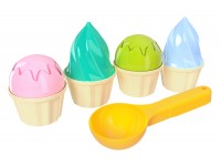 4 cream-colored cupcakes molds with cream and a spoon are included in the "Sand set TechnoK", art.6610. The cream for the molds has different colors, shaped like “ice cream balls with fondant” and "cream".