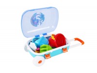 The Mega Cool "Sand Play Set TechnoK" comes in a bright suitcase. The set includes a bucket, a funnel, a shovel, rakes, and 6 "fruit" sand molds. All the toys are conveniently stored in the suitcase with a transparent cover, making it perfect to take along on outings.