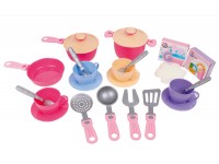 The set includes everything necessary to cook every culinary idea. There is a pan and a stew pan for delicious “borshch” and healthy vegetables and also a frying pan. A skimmer, a scoop, a big fork and a spatula will make the cooking process more realistic. Children can also meet friends with fragrant tea thanks to colorful cups and saucers.