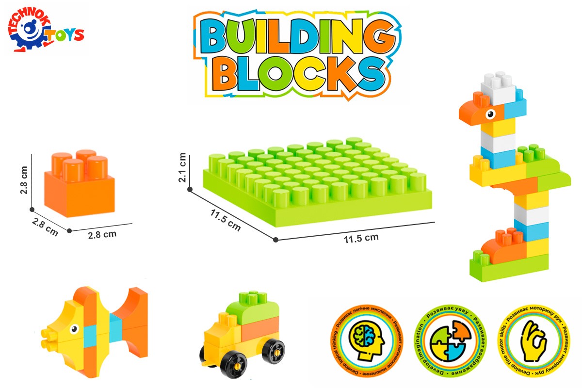 The construction set with different building blocks develops fine motor skills and helps to train coordination of movements. Also, parents, playing with children, teach them new words: names of colors, shapes, animals, buildings and transport. Assembling a whole structure, children develop imagination and spatial thinking. Exciting games with the construction set educate attention, patience and perseverance. Playing together, children develop social and communication skills. They have to cooperate, discuss further steps and agree to solve the tasks.
