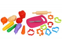 Complete set: a tabletop with a sink and a tap, a pan with lid, a frying pan, spoons – 4 pcs., forks – 4 pcs., a knife, plates – 4 pcs., cups – 4 pcs., saucers – 4 pcs., molds of different shapes – 16 pcs., a cucumber, a carrot, an eggplant, a tomato, a potato, an onion, corn, a pepper, boxes – 2 pcs., a rack, a scoop, a skimmer, a big fork, a spatula, a whisk, a potato masher, a board, a working rolling pin, a sponge, a sugar holder with lid, a teapot with lid.