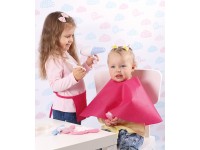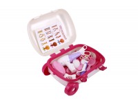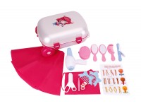 Kit: suitcase, toy hairdryer and curling iron, comb, brush, mirror, 2 hairpins, powder box, tweezers, scissors, cape, belt, 4 hair ties, braiding instructions.