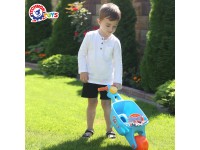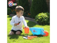 The basis of the set is a bright blue wheelbarrow with a large sturdy wheel, a leg and soft rubberized handles. The design makes it resistant to overturning during turns, descents or climbs. In a wheelbarrow, you can transport apples collected in the garden, leaves, sand or even your toy friends)