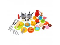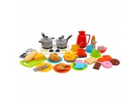 This set will take your child into the world of culinary fantasies! It includes everything needed to create the atmosphere of a real kitchen: a pot with a lid, a frying pan, a saucepan with a lid, a coffee pot, a sugar bowl, various dishes, cutlery, and even toy food items. The bright colors and realistic design of the elements capture attention and inspire play.