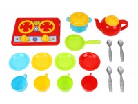 У комплект входить варильна поверхня, 4 чашечки, 4 блюдечка, 4 ложки, чайник, каструля та сковорідка.