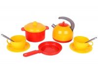 В комплект посуду входить: сковорідка, чайник, каструля з кришкою, 2 чашки на блюдечках та 2 ложечки.
