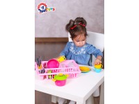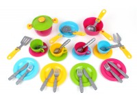 У наборі є все, щоб маленька господинька реалізувала свої кулінарні задуми. Каструлька та сотейник для смачних борщів та корисних овочів, сковорідка для смаження. Шумівка, черпак, велика виделка та лопатка зроблять процес приготування максимально реалістичним. Також малеча зможе запросити друзів на чаювання з різнобарвними горнятками на блюдечках.