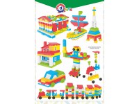 Цеглини різних розмірів, віконця, двері та парканці для будівництва будиночків та замків. Набір дорожніх знаків, фігури машинок та літака стануть у пригоді для ігор з гаражами та паркінгами.