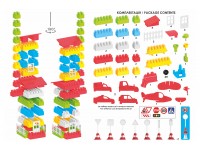 Цеглини різних розмірів, віконця, двері та парканці для будівництва будиночків та замків. Набір дорожніх знаків, фігури машинок та літака стануть у пригоді для ігор з гаражами та паркінгами, платформи з колесами.
