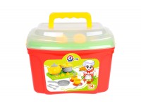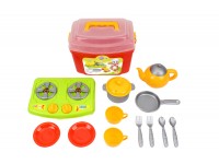 Дитячий набір посуд у яскравій валізі з прозорою кришкою та зручною ручкою. Одночасно валіза є газовою плитою. На ній малюк зможе приготувати смачні страви для іграшкових друзів та пригостити їх чаєм.