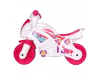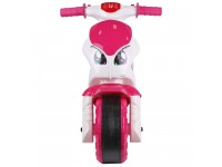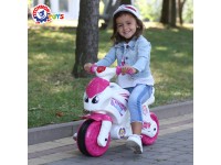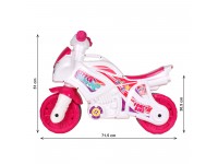 У кермо мотоцикла вбудовано дві кнопки, натискаючи на які дитина отримає різні варіанти звуку. Зацікавленість та справжній захват у малюків викличе і яскраве «веселе» світло, що з’являється при натисканні на одну із кнопок. Оздоблений мотоцикл милими наліпками у гармонійній з виробом колірній гамі.