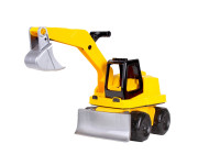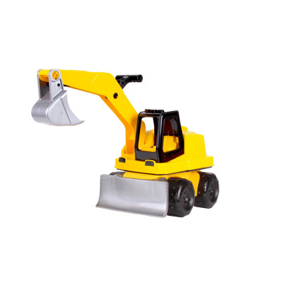 Кабіна іграшкового трактора обертається на 180 градусів, а ківш регулюється за допомогою спеціального важеля. Колеса трактора великі, міцні та надійні.