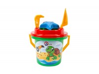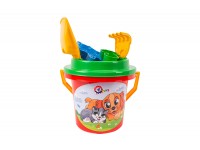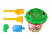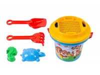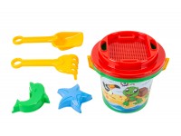 Яскраве відерко з веселим малюнком та зручною ручкою, лопатка, грабельки, 2 формочки для піску та сито. Лопатка та грабельки допоможуть малюку створити неймовірні шедеври в пісочниці. Дві кольорові формочки дозволять створити різноманітні пісочні фігури. В ситі є 2 додаткові отвори для зручного носіння грабельок та лопатки.