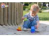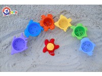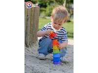 На верхній фігурі «морська зірка» є млинок, що обертається при наливанні водички. Через різні ситечках на дні кожної формочки водичка «втече з пірамідки». І так можна гратися безліч разів. Елементи пірамідки також добре використовувати як пасочки, а ситечко на дні – як штамп на піску.