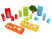 Всі «герої» нанесені на елементах різного кольору, що значно полегшить пошук відповідних картинок. Діткам потрібно самостійно зібрати основну фігуру з трьох великих цеглин: голова, тулуб і ніжки. А з менших цеглин підібрати їх малюків та смаколики. Додаткового ігрового моменту додає також картонна фігура дерева, яке можна зібрати на ніжку та використовувати під час різноманітних ігор.