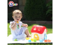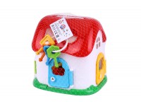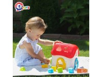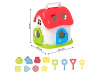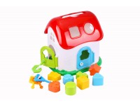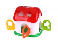 Іграшка "Будиночок" - це велика хатинка з 4-ма дверима під червоним дахом. Через фігурні отвори у дверях в середину можна проштовхнути фігурки звірів: жабки, коника, ведмедика та метелика. А щоб дістати звіряток, необхідно відкрити дверцята відповідним ключем. Для допомоги малюкам кольорові підказки – фігурки звіряток, дверей та ключиків співпадають по кольору. Форма ключика також не випадкова і відповідає замочку на конкретних дверях: квадрат, трикутник, ромб та зірка. Через отвори у даху також можна проштовхнути формочки геометричних фігур. Ці формочки спеціально спроектовані для правильного навчання - вони високі, і їх не можна проштовхнути боком, або у невірний отвір.