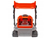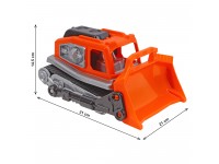 Спецтранспорт оснащений величезним ковшем, який при переміщенні бульдозера на іншу локацію підіймається та фіксується над кабіною для того, щоб машиніст краще бачив дорогу. Також у ковші малюк зможе перевозити різні сипучі матеріали до місця призначення. Всепрохідність та потужність бульдозеру забезпечують гусениці. Іграшка не ковзатиме по поверхні оскільки гусениці з глибоким рифленням й виготовлені з м'якого пластику. Кабіна теж як у справжнього бульдозера – велика, об’ємна ще й з сидінням для машиніста. Об’ємний моторний відсік позаду машиніста підкреслює величезну силу цієї будівельної техніки.