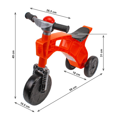 Особливістю моделі є сучасна кольорова гама — трендовий помаранчевий колір в поєднанні з чорним. Колеса, виготовлені за видувною технологією, гарантують м’який та тихий хід, що робить катання ще приємнішим як для дитини, так і для батьків. Ролоцикл ТехноК — це не просто іграшка, а надійний супутник для веселих прогулянок на свіжому повітрі. Дозвольте своїй дитині відкрити радість руху з іграшкою, що поєднує інновації, безпеку та сучасний дизайн. Безпечна іграшка для дітей від 1-го року.