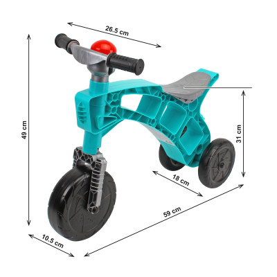 Особливістю моделі є сучасна кольорова гама — трендовий бірюзовий колір в поєднанні з чорним. Колеса, виготовлені за видувною технологією, гарантують м’який та тихий хід, що робить катання ще приємнішим як для дитини, так і для батьків. Ролоцикл ТехноК — це не просто іграшка, а надійний супутник для веселих прогулянок на свіжому повітрі. Дозвольте своїй дитині відкрити радість руху з іграшкою, що поєднує інновації, безпеку та сучасний дизайн. Безпечна іграшка для дітей від 1 го року.