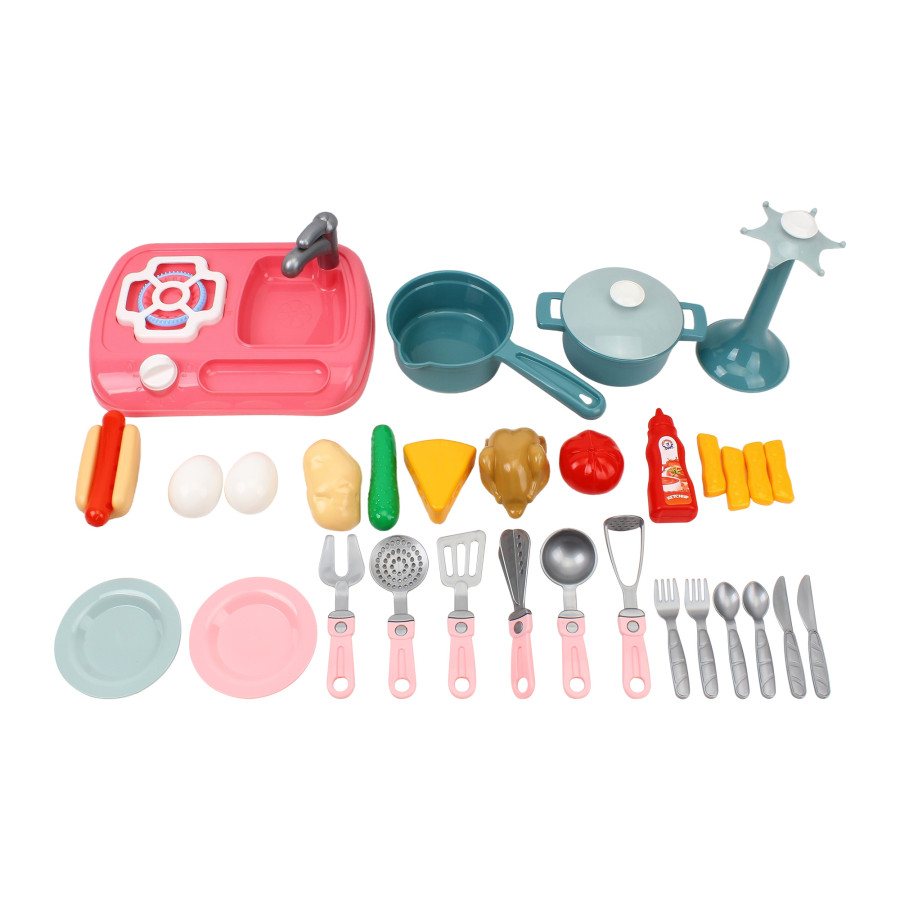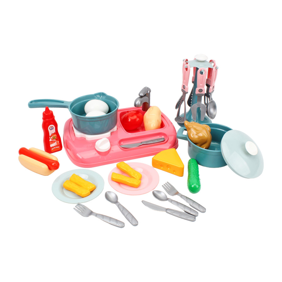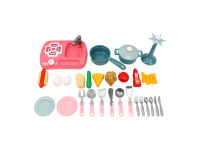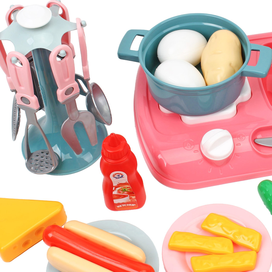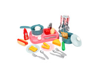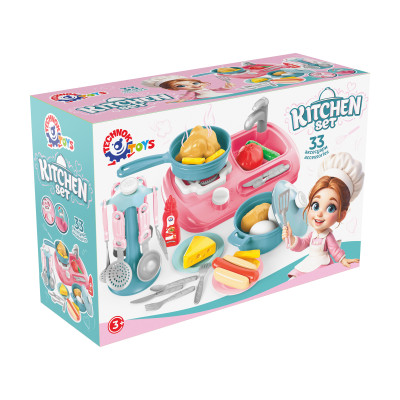 Набір вражає своєю комплектацією: 33 аксесуари, серед яких варильна поверхня з мийкою, каструлі, сковорідка, столові прибори та ціле розмаїття реалістичних продуктів (від золотистої курки до овочів та хот-догів). Приємна пастельна кольорова гама в поєднанні з соковитими відтінками їжі робить гру візуально естетичною та захопливою.