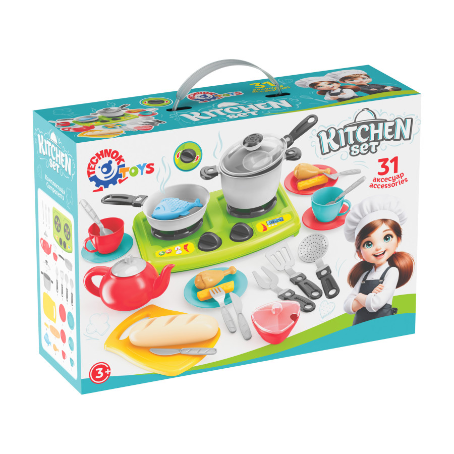 Відчуйте магію приготування вечері з новим Кухонним набором ТехноК! Цей набір створений для тих, хто любить деталі та сюжетні ігри. Головною особливістю є яскрава зелена 2-хкафорна газова плита з ручками-регуляторами та великий вибір кухонного приладдя.